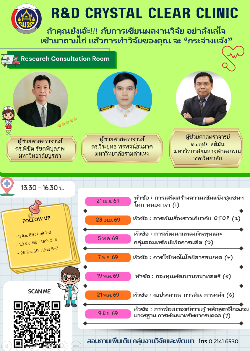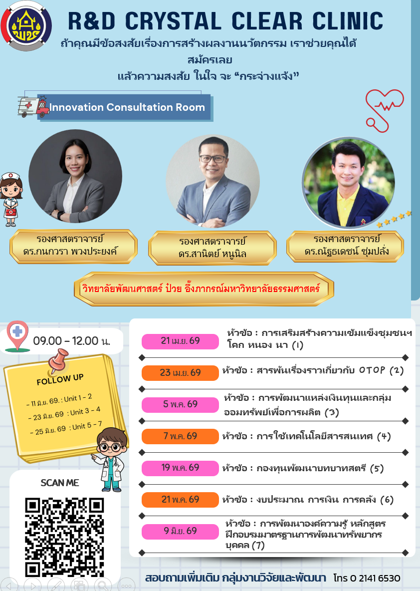 สถาบันการพัฒนาชุมชน เอาใจคนรักงานวิจัยและนวัตกรรม เปิด R&D Crystal Clear Clinic (คลินิกวิจัยและนวัตกรรมกระจ่างแจ้ง) เพื่อเป็นช่องทางในการเสริมความรู้ ให้คำปรึกษาแก่ผู้เข้าร่วมกิจกรรมให้เกิดความกระจ่างแจ้งด้านงานวิจัยและนวัตกรรม อีกทั้งยังช่วยส่งเสริมให้นักวิจัยและนวัตกรชุมชนได้พัฒนาทั้งตนเองและผลงานให้มีคุณภาพ สามารถร่วมเวทีประกวดผลงานวิจัยและนวัตกรรมงานพัฒนาชุมชนที่มีความโดดเด่น ประจำปี 2569 เพื่อให้งานวิจัยและนวัตกรรม กรมการพัฒนาชุมชน ก้าวไปอีกขั้น อย่างมั่นคง และยั่งยืน
