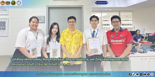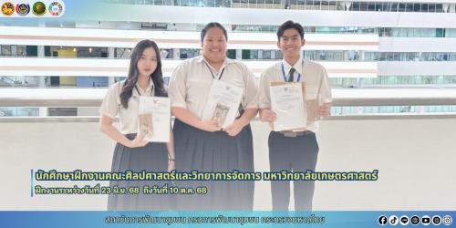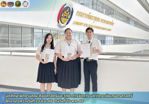 🎓✨โดยนิสิตนักศึกษาปริญญาตรีที่สำเร็จการฝึกงาน ฯ จากคณะศิลปศาสตร์และวิทยาการจัดการ มหาวิทยาลัยเกษตรศาสตร์ วิทยาเขตเฉลิมพระเกียรติ จังหวัดสกลนคร จำนวน 3 ราย ได้แก่ 1) นายจักรพรรณ จงพิมาย ฝึกงาน ณ สำนักงานเลขานุการกรม 2) นางสาวโสภิตนภา สมบัติ ฝึกงาน สำนักตรวจราชการ และ3) นางสาวมณีวรรณ กรมวังก้อน ฝึกงาน ณ สำนักส่งเสริมภูมิปัญญาท้องถิ่นและวิสาหกิจชุมชน ) ซึ่งเข้าฝึกงานระหว่างวันที่ 23 มิถุนายน 2568 ถึงวันที่ 10 ตุลาคม 2568
