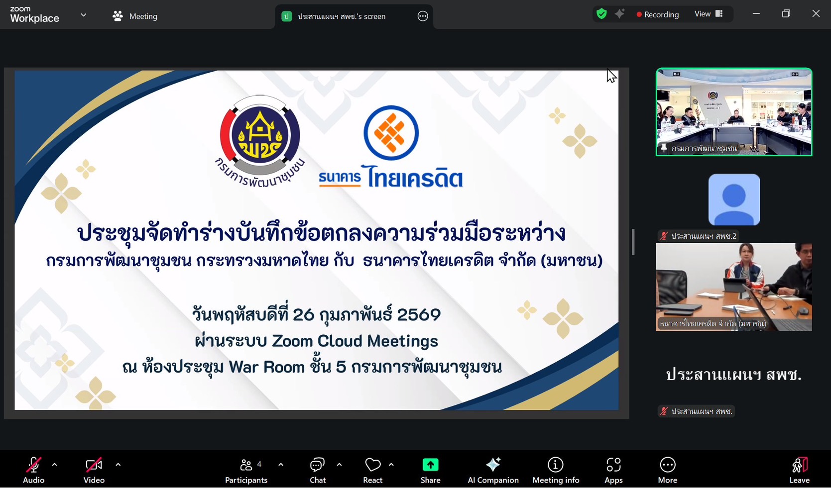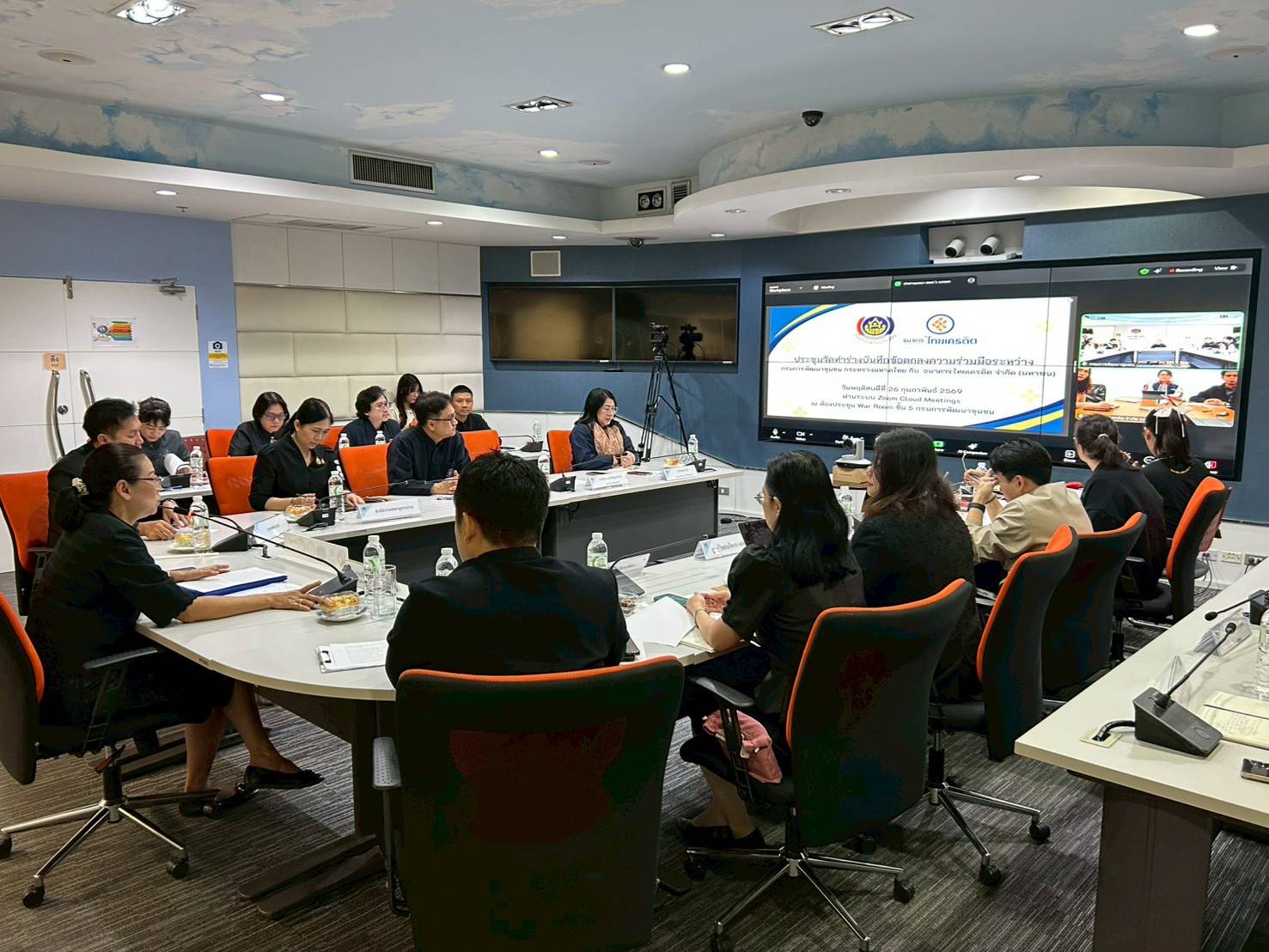 ในการนี้ มีผู้อำนวยการกองแผนงาน ผู้แทนสำนักส่งเสริมภูมิปัญญาท้องถิ่นและวิสาหกิจชุมชน สำนักเสริมสร้างความเข้มแข็งชุมชน สำนักพัฒนาทุนและองค์กรการเงินชุมชน สำนักงานกองทุนพัฒนาบทบาทสตรี สำนักงานเลขานุการกรม กลุ่มพัฒนาระบบบริหาร กองนิติการ และผู้แทนธนาคารไทยเครดิต จำกัด (มหาชน) เข้าร่วมประชุมอย่างพร้อมเพรียง ณ ห้องประชุม War Room ชั้น 5 กรมการพัฒนาชุมชน และผ่านระบบ ZOOM Cloud Meetings