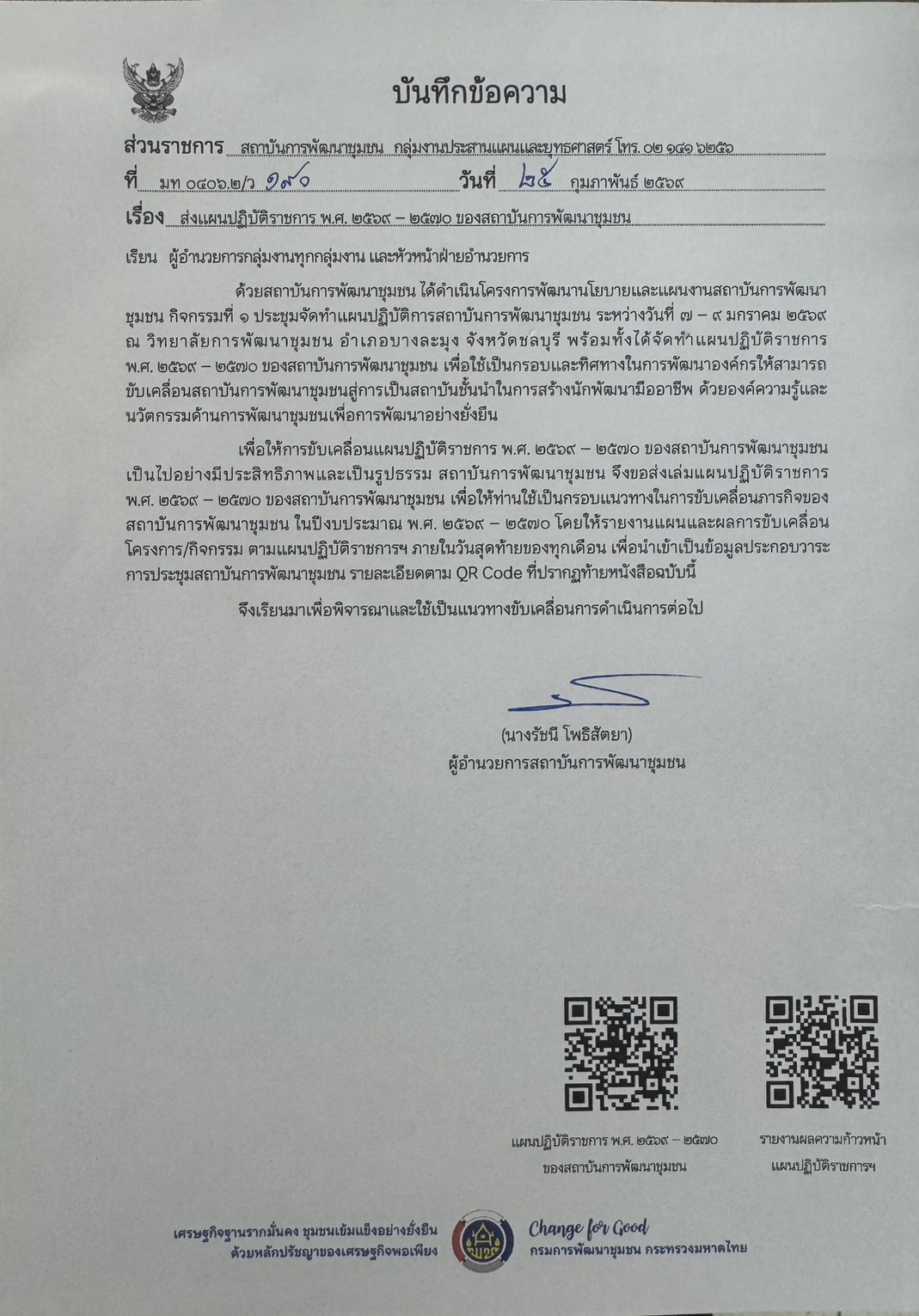 รายงานฉบับนี้ เป็นรายงานผลการดำเนินงานโครงการพัฒนานโยบายและแผนงานสถาบันการพัฒนาชุมชน กิจกรรมที่ 1 ประชุมจัดทำแผนปฏิบัติการสถาบันการพัฒนายุมชน ซึ่งกรมการพัฒนาชุมชน อนุมัติให้สถาบันการพัฒนาชุมชน ดำเนินการระหว่างวันที่ 7 - 9 มกราคม 2569 ณ วิทยาลัยการพัฒนาชุมชน อำเภอบางละมุง จังหวัดชลบุรี และข้อเสนอเชิงนโยบายที่เป็นผลผลิตจากการจัดทำแผนปฏิบัติราชการ พ.ศ. 2569 - 2570 ของสถาบันการพัฒนาชุมชน